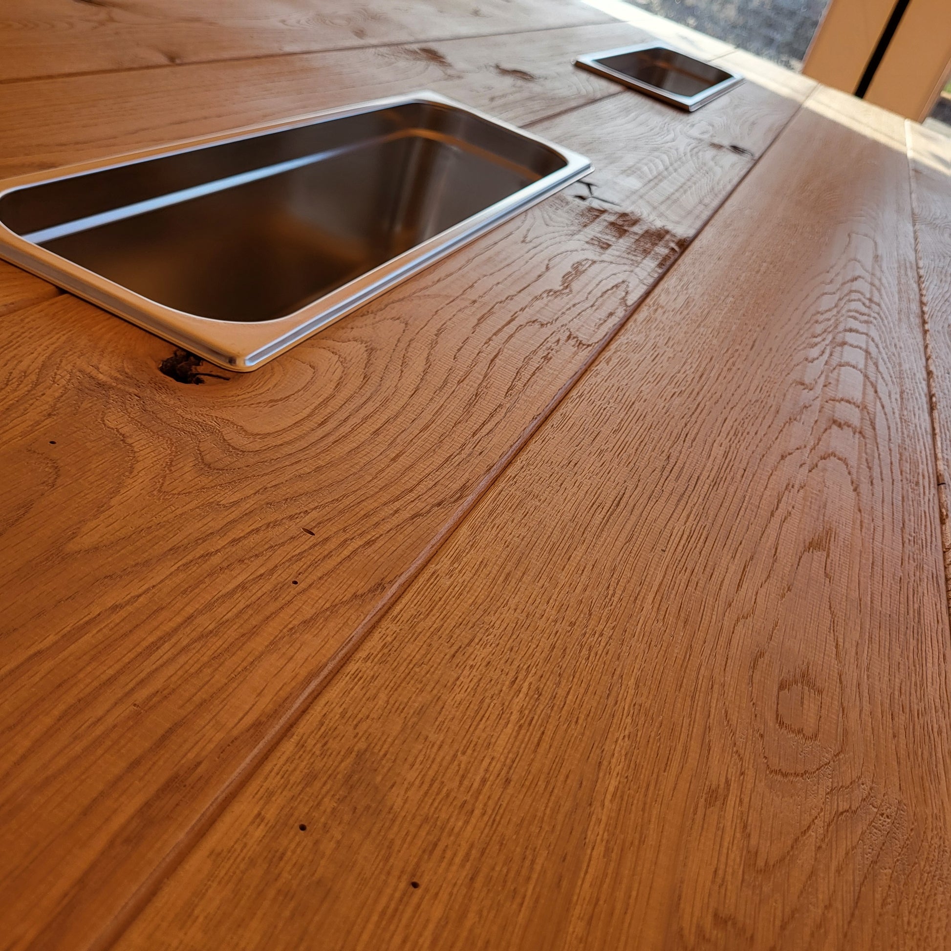 Eventtische aus massiver Eiche mit integriertem Edelstahlbehälter