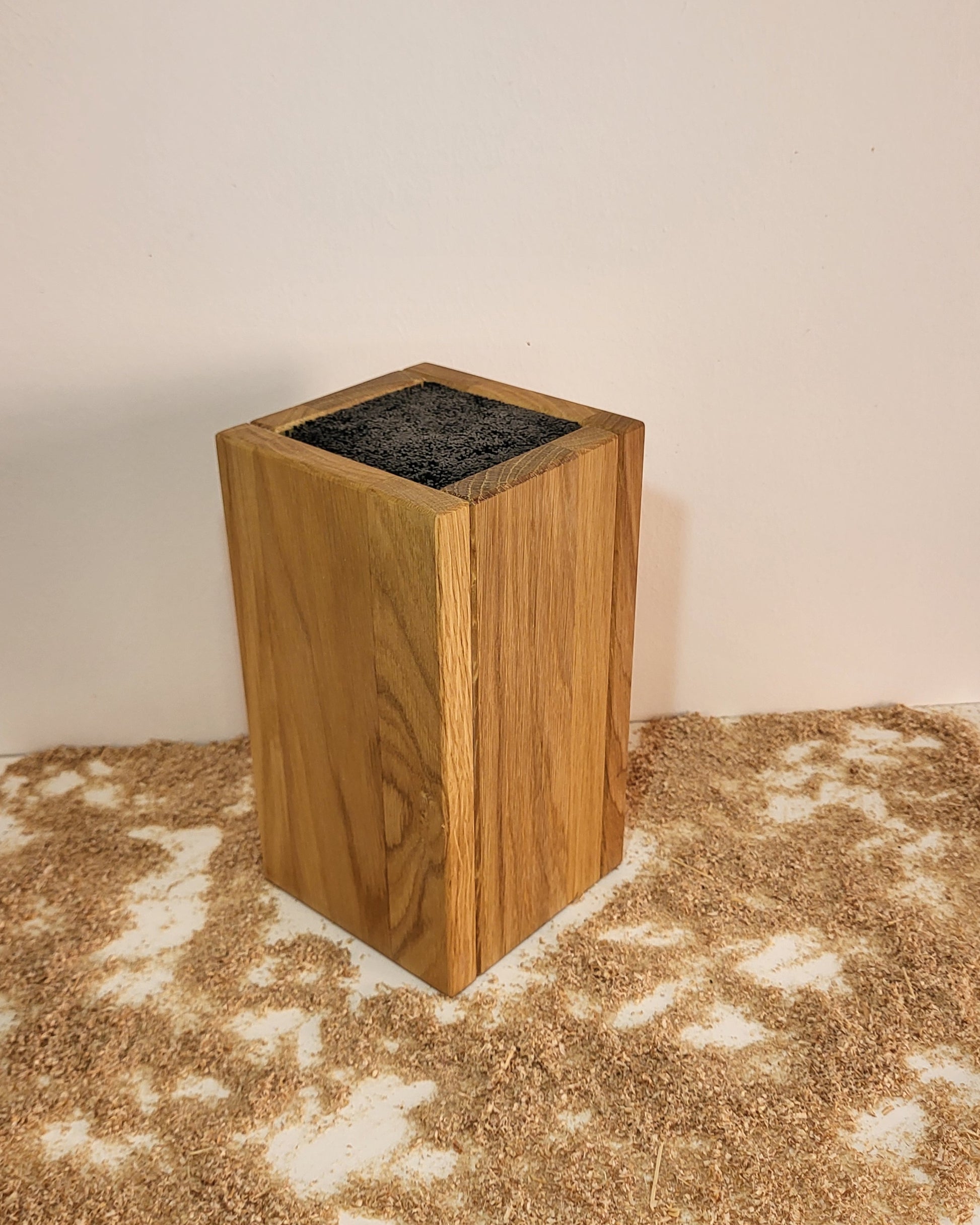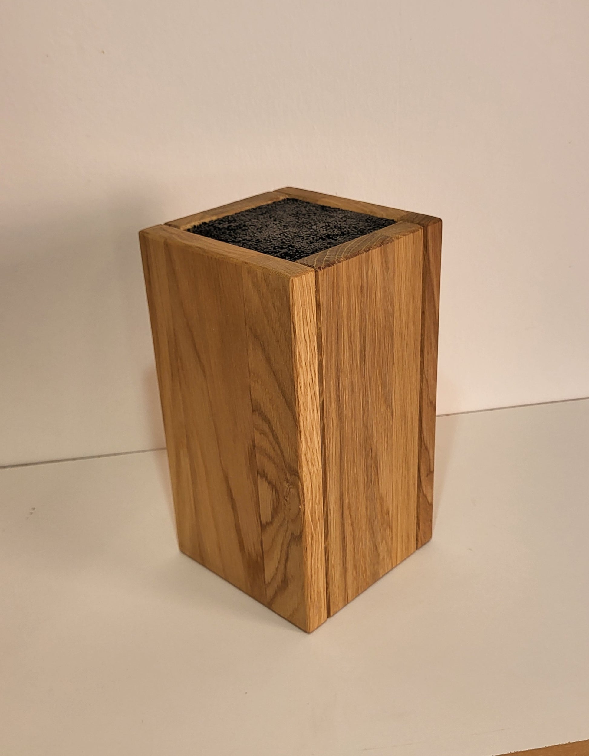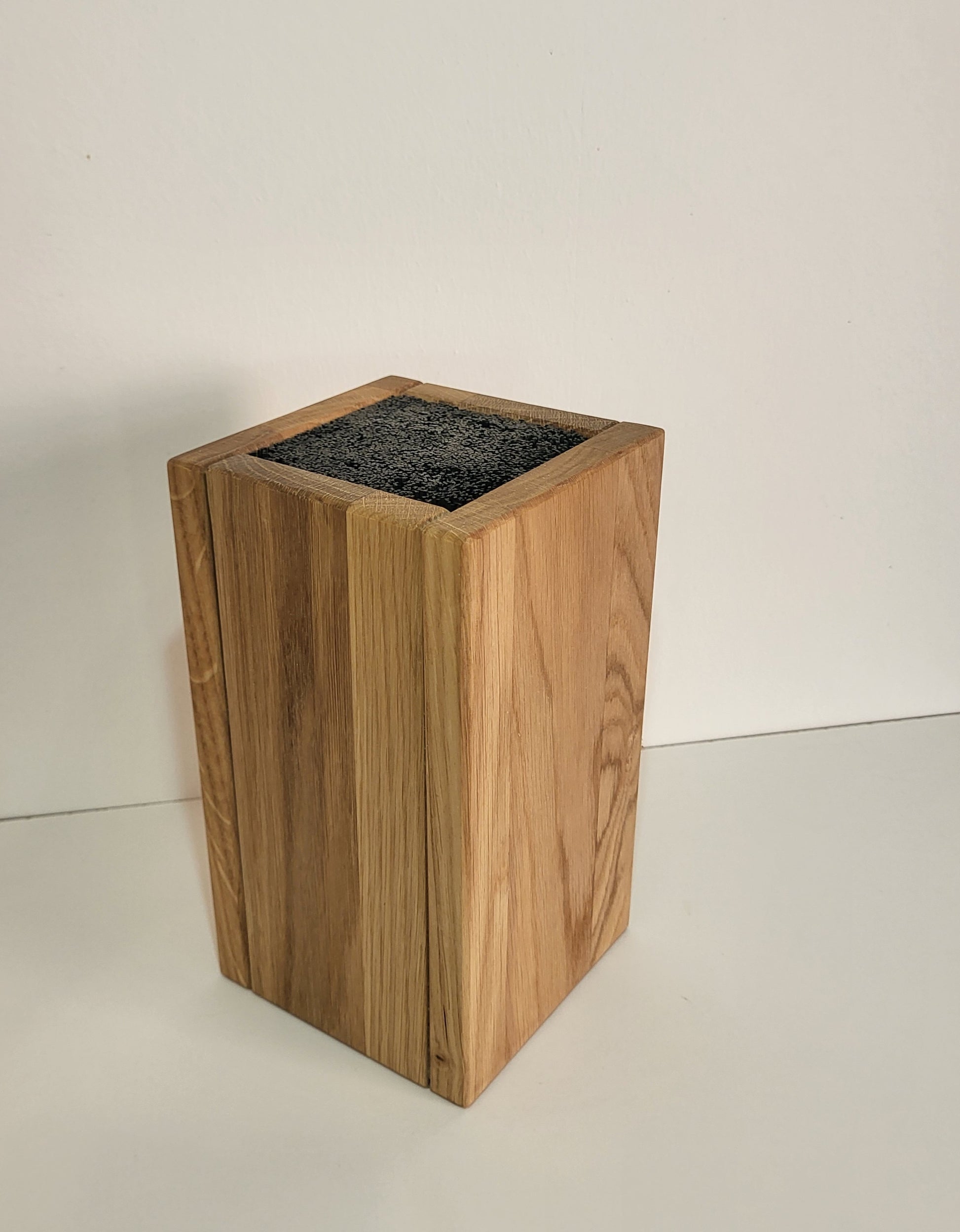 Dieses Exemplar bietet eine ruhige Atmosphäre und bringt Klasse in die Küche. Durch seine schlichte Oberfläche strahlt er eine entspannte und geordnete Stimmung aus, die jedoch durch seine durchdachte Kantenbearbeitung optisch gebrochen wird und der Messerblock so auf sich aufmerksam macht. Das Spiel zwischen handgemachter Individualität und dem klassischen Stil des Eichenholzes macht den STIL Messerblock VI aus.