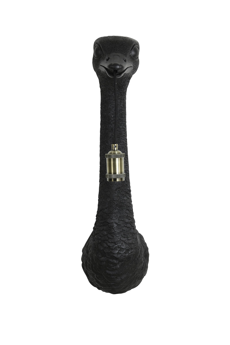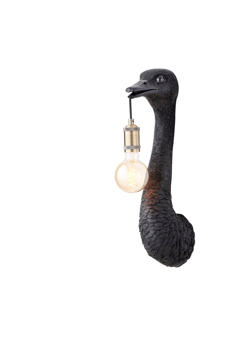 Entdecken Sie die Ostrich Wandlampe für Dschungelfieber im Wohnraum! Die matte schwarze Strutsfigur dient nicht nur als Deko, sondern auch als funktionale Pendellampe. Einfache Montage, Bedienung über den Schalter am Kabel. Kein Anschluss an Deckenlicht nötig, einfach einstecken. Maße: 18x15,5x57,5 cm, E27-Fassung, aus Kunststoff.